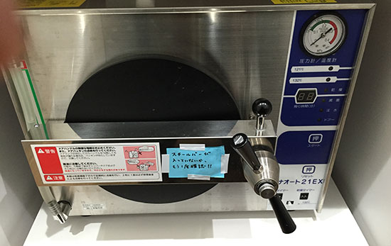 それ以外の器具はオートクレーブという設備を使用し、高温高圧の飽和水蒸気による滅菌処理を施しております。歯の治療に用いる器具は消毒液の中に漬け、超音波洗浄機にかけてパック後にオートクレーブ滅菌を行っております。これにより医療器具や空中雑菌による院内感染を防いでいます。