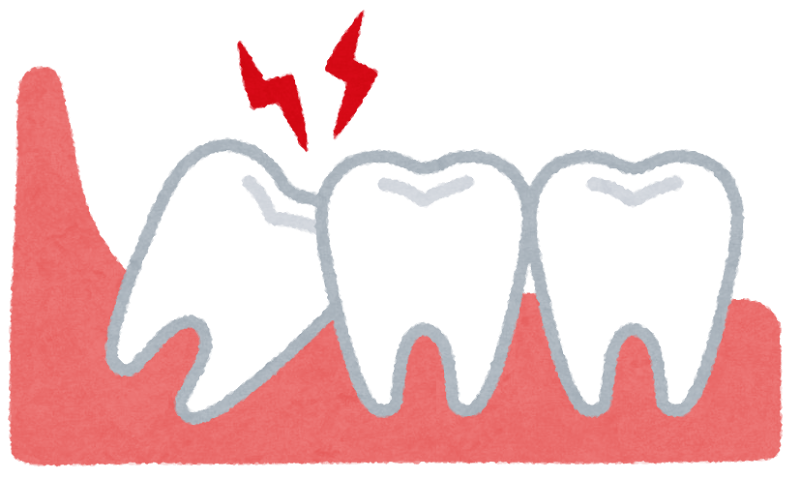 埋伏歯や、隣の歯にもたれかかるようにして生えた親知らずは、隣の歯への虫歯の負担になる他、歯みがきが行き届かず虫歯にもなりやすいです。