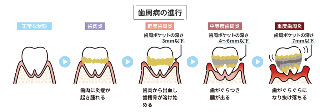 歯周病とは、細菌の感染によって引き起こされる炎症性疾患です。歯垢の中の歯周病菌が歯肉に炎症を起こし、歯肉・歯槽骨などの歯周組織をじょじょに破壊していく病気です。進行が進むと歯の周りの歯肉(歯茎)や、歯を支える骨などが溶けてしまいます。